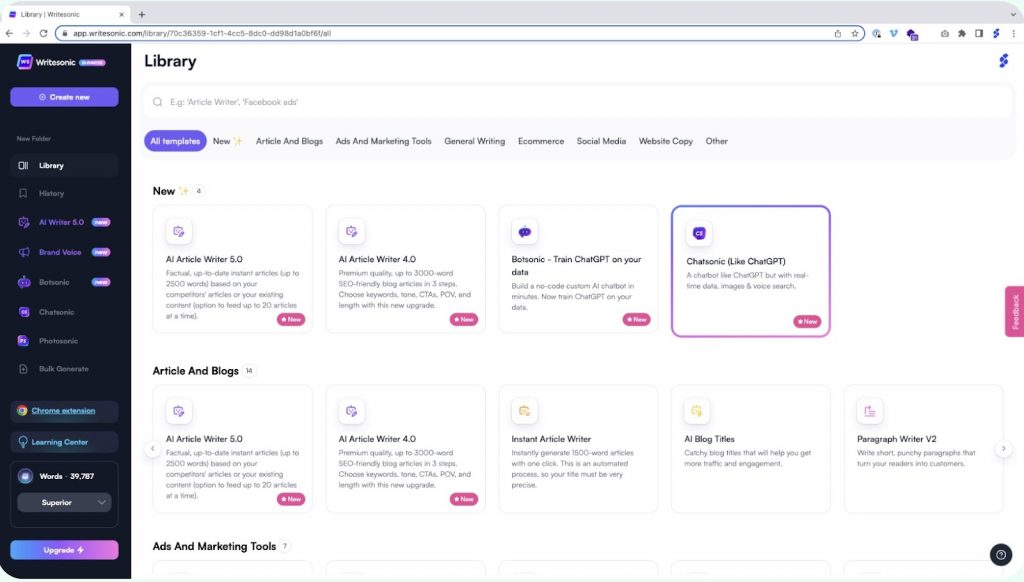 Writesonic is another AI writing platform that includes several SEO-focused features for bloggers and marketers. The tool can generate blog posts, landing page copy, and marketing content while integrating optimization insights.